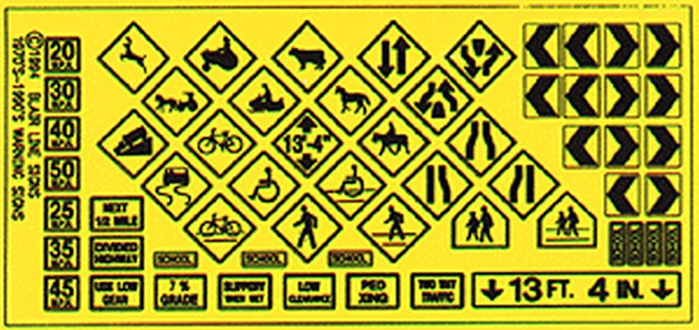 Scale signs, printed in color on thin plastic for easy assembly. Each set of signs includes scale posts, CAD designed to Federal Specifications for accuracy and authenticity. Great roadside, streetside and trackside details.