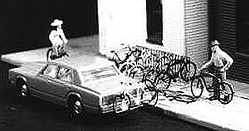 Great for park or school playground! Eight bicycles in four common American styles (including boy’s and girl’s models from 1940s to present) and one schoolyard-type bike rack.