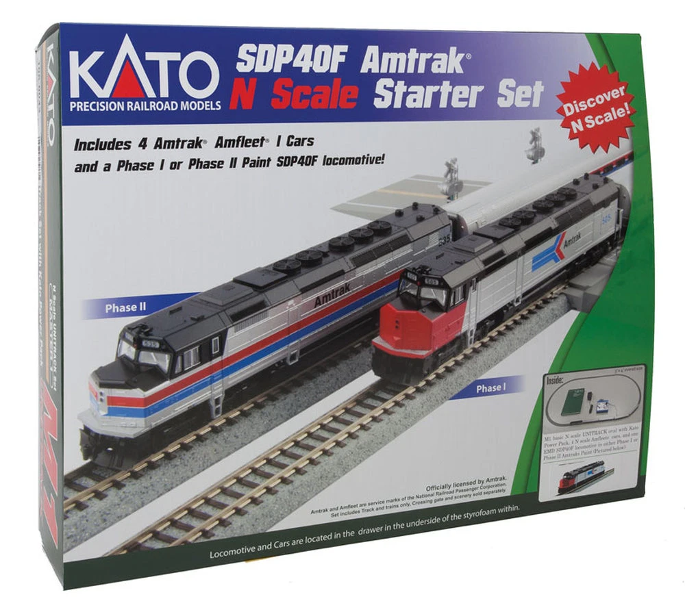 The Kato N Scale SDP40F Amtrak Starter Set is a great way to get started in modeling Amtrak trains. Pulled by an EMD SDP40F type I diesel decorated in the Phase I red-nose paint scheme, a train of three Amfleet coaches and a cafe car make their way around an oval of Unitrack roadbed-style track. The set includes an oval of track with 12-3/8″ radius curves, a grade crossing-rerailer section, power pack and instructions. Durable Unitrack features Code 80 nickel silver rail, realistic molded roadbed for setup on any surface, strudy rail joiners (Unijoiners) which provide secure connections and electrical continuity.