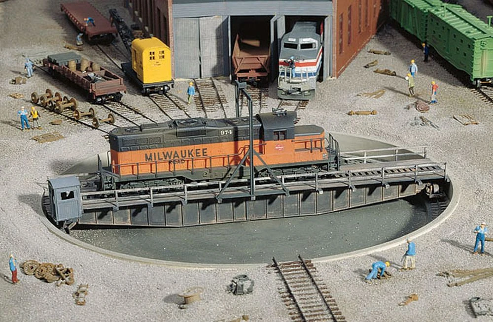 Found at small engine terminals, the 90′ turntable has long been a vital part of train operations. On your layout, it makes a great centerpiece for small steam or diesel locomotive servicing facility. Carefully designed to fit most layouts, the 90′ turntable has a one-piece pit for drop-in mounting. Once assembled, the bridge is manually positionable. The kit includes the pit, gear drive, bridge, operator’s cab, arch, handrails, realistic decals and complete instructions. Complete hookup instructions cover wiring, adding track and more. The detailed bridge includes the operator’s cab, handrails and a traditional arch (used to supply electrical power to the drive motors on the prototypes). This model can be motorized by adding Motorizing Kit 933-1050 (sold separately).