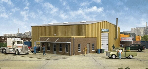 Combining office and a large work area into one structure, Washington Salvage is typical of the main buildings at many businesses, especially today’s materials recycling facilities found in many communities. And, this combination of brick office and steel garage structure has been common since the 1960s, so your model could also serve as a county or city highway department garage, bus barn for a local mass transit authority, construction company offices, truck or farm equipment dealership or any one of hundreds of similar businesses.