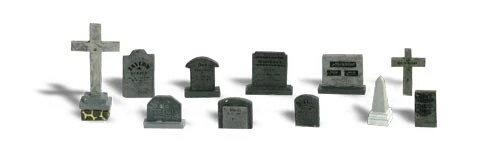 Eleven pieces are included in this assortment of square, rounded, cross and obelisk tombstones.