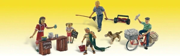 Create a reminiscent summer scene with the proverbial lemonade stand, a paperboy and lawn boy.